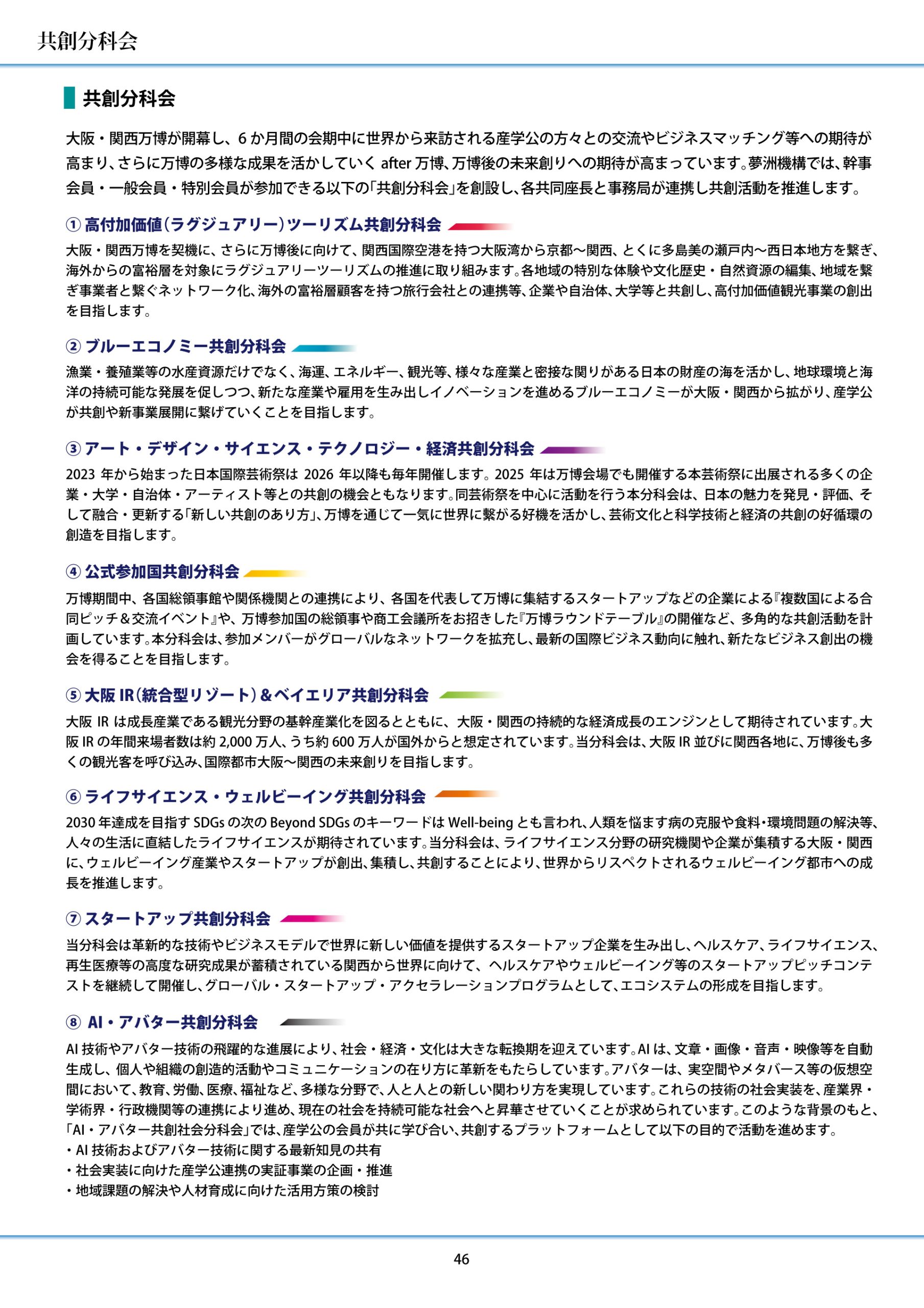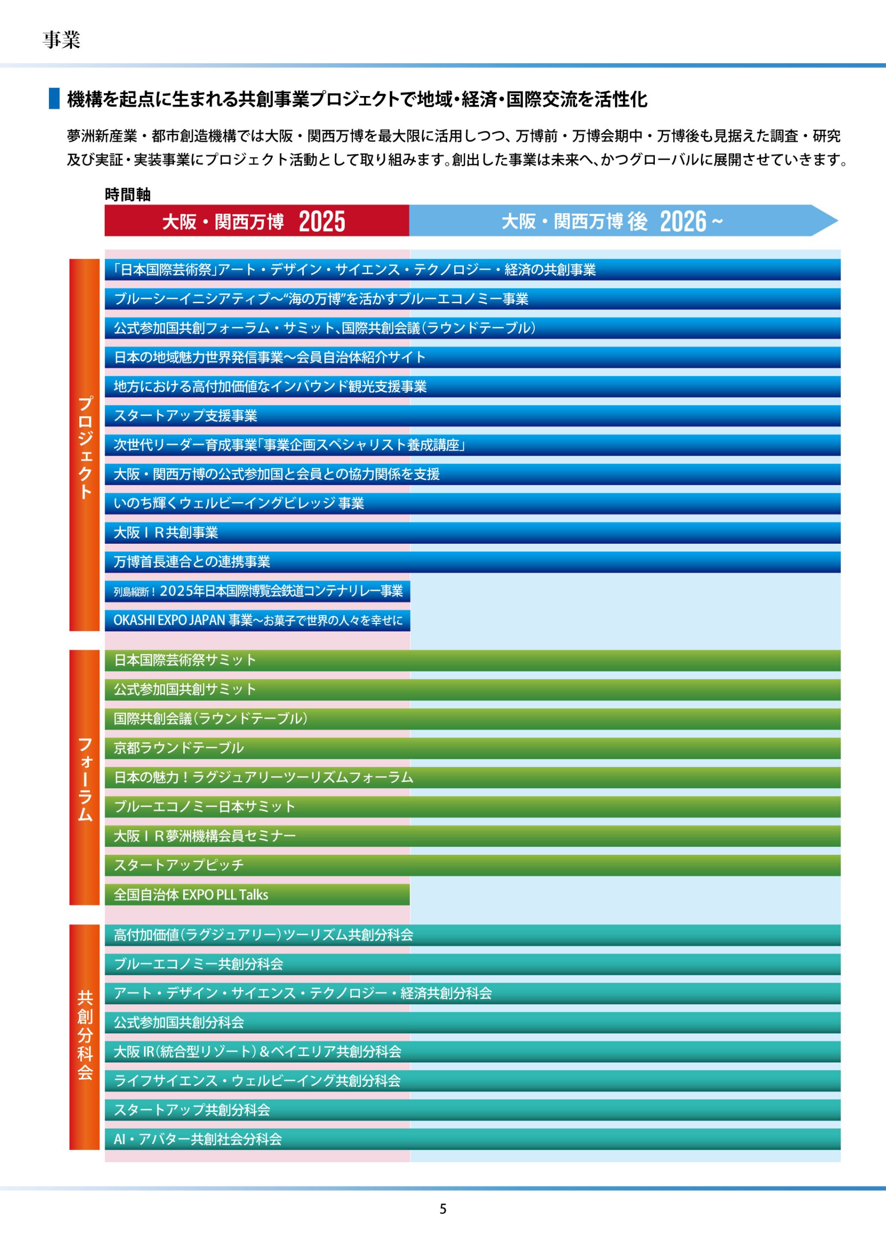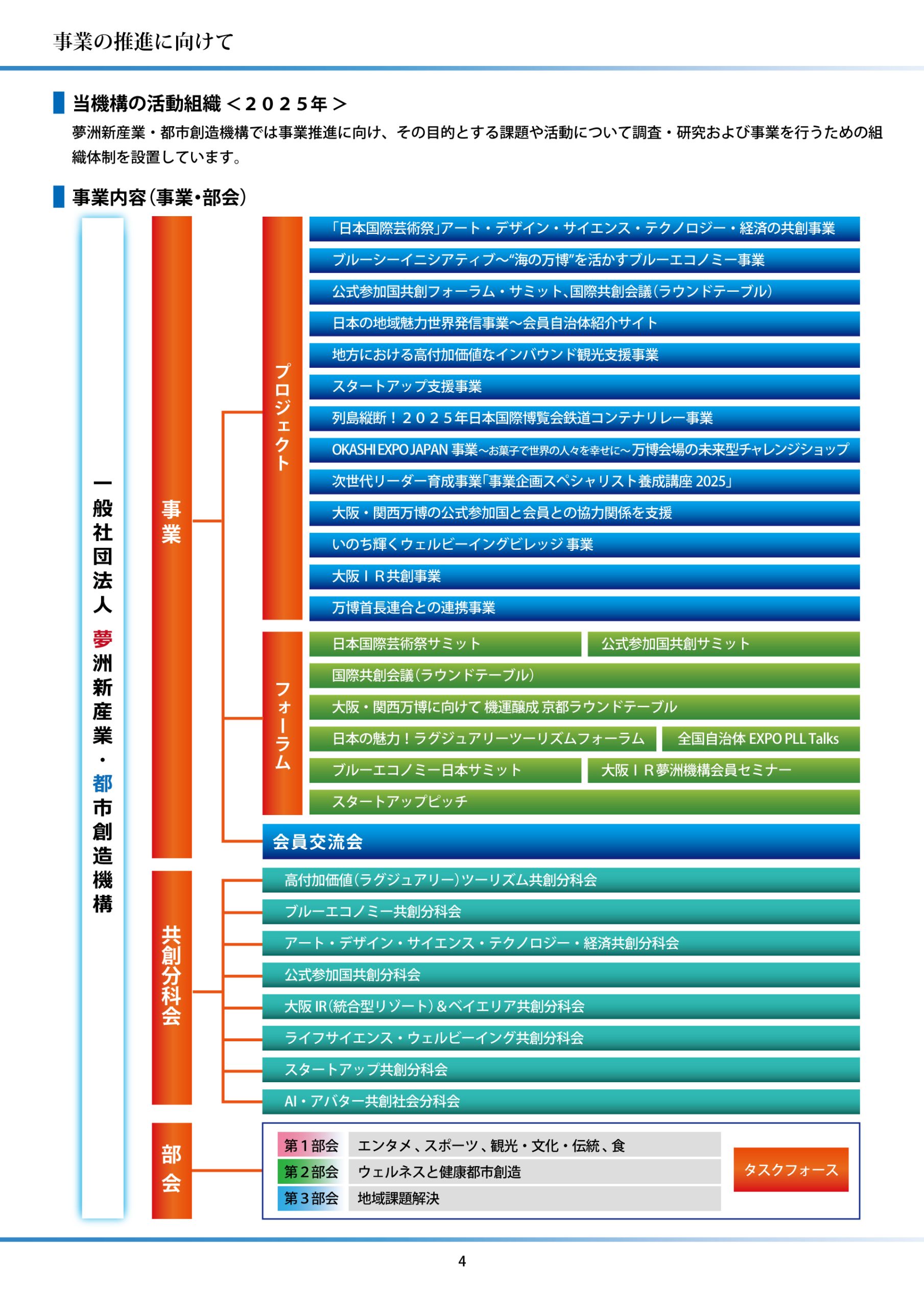 (一社)夢洲新産業・都市創造機構は、大阪・関西万博を契機に設立された産学公共創のオープンイノベーション・プラットフォームです。新産業創出、環境・エネルギー、医療、アート、観光、地方創生など幅広い分野で共創を推進しています。158か国・地域が参加した大阪・関西万博の成果を活かし、2030年開業の大阪IRも踏まえ、国内外のネットワークを繋ぎ、夢洲から大阪・関西~全国で持続可能で創造的な“いのち輝く”未来社会を実現するために貢献します。
