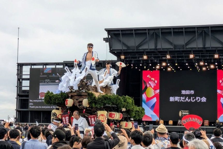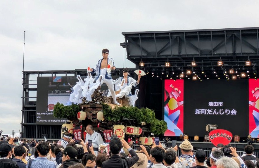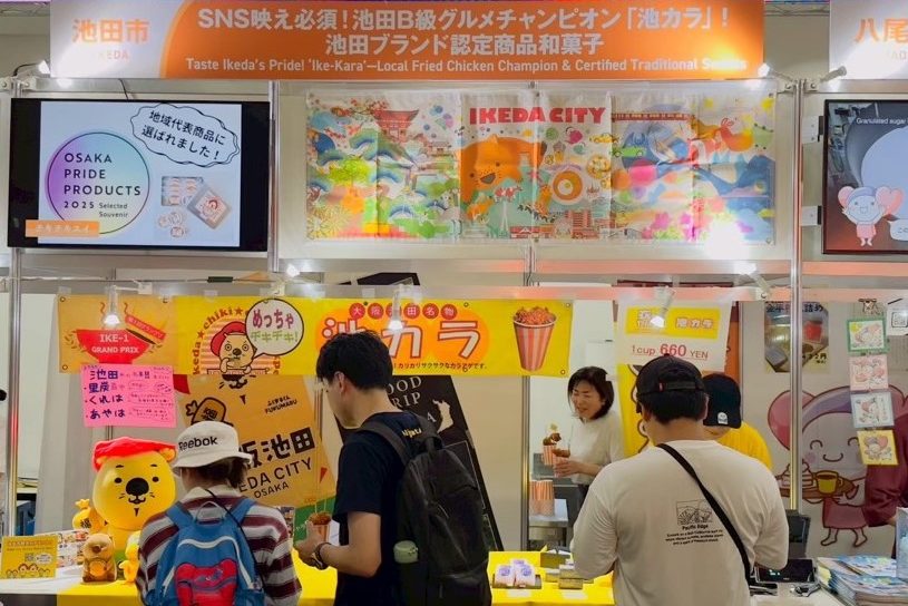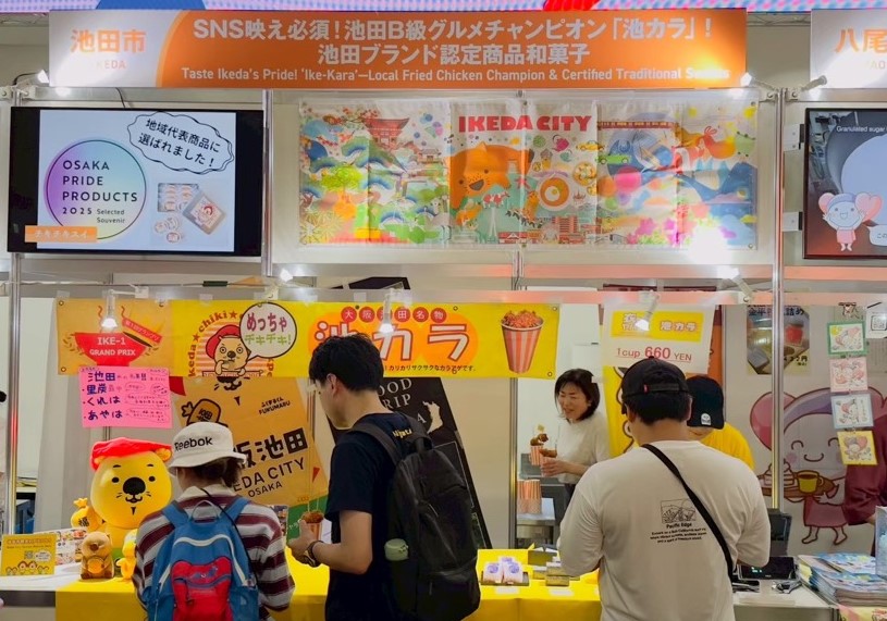 2025年大阪・関西万博の会場で府内自治体が各地の魅力を発信する取組に参画し、本市のPRを行いました。たべなはれゾーンでは観光案内所が出店し、チキンラーメンの衣がついた唐揚げ「池カラ」やチキンラーメンを使った「チキチキスウィーツ」、池田ブランド認定の和菓子を販売しました。また、「大阪の祭!~EXPO2025春の陣~」では、新町だんじりが展示及び巡行を行い、世界へPRすることができました。