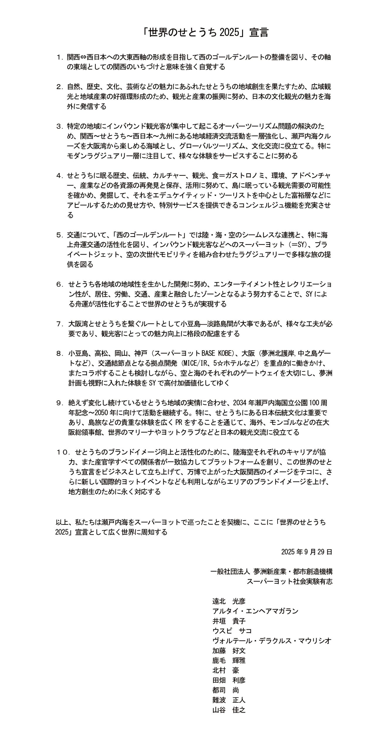 2025年大阪・関西万博会場~瀬戸内国際芸術祭会場を、スーパーヨット*のルートで結ぶ社会実証実験を9月29~30日に行いました。同実験を基にし、歴史・文化と伝統にあふれた瀬戸内海の多島美を世界にアピールするために「世界のせとうち2025宣言」を9月29日にまとめました。それをもって思いを同じくする関係者に対する羅針盤とし、瀬戸内の文化資源の磨き上げと国際的な観光地位向上を目指し、後世へ継承してゆく機運の醸成を図ってゆきます。