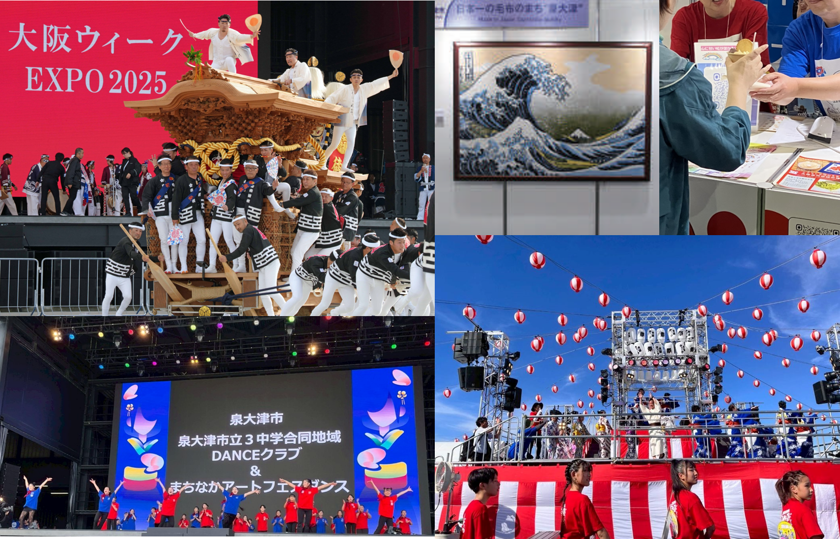 大阪府・大阪市が主催する「大阪ウィーク~春・夏・秋~」の「春の陣」「真夏の陣」に出展しました。「春の陣」では泉大津市内の南曽根自治会が出展し、だんじり曳行と地車囃子演奏を行いました。「真夏の陣」の「交流盆踊り」ではREIWA 盆ダンスと大津おどり保存会が、「次世代パフォーマンス」では泉大津市立3中学合同地域DANCEクラブ&まちなかアートフェスダンスチームがパフォーマンスを披露しました。また、「地域の魅力発見ツアー」では、泉大津のアートブランケットを展示したほか、泉州泉大津の銘菓であるくるみ餅をアレンジしたスイーツを販売しました。そのほか、万博首長連合が主催する「LOCAL JAPAN展」やその他のイベントに、他の自治体と合同で出展しました。