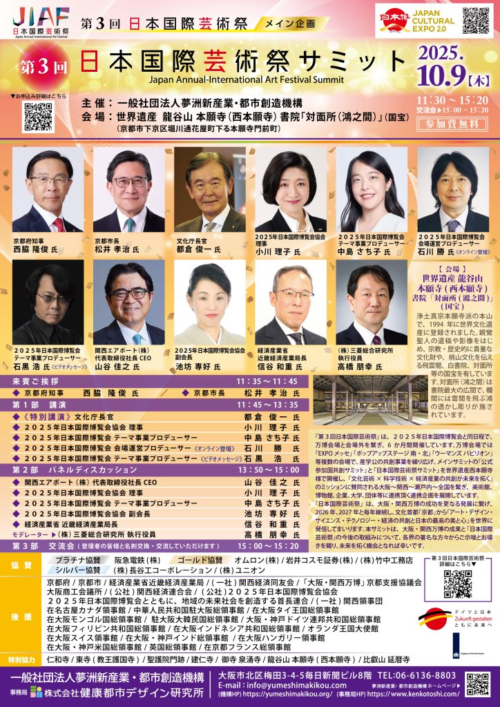 「日本国際芸術祭」は、大阪・関西万博の成功を更なる発展に繋げ、2026 年、2027 年と毎年継続し、文化首都「京都」から「アート・デザイン・サイエンス・テクノロジー・経済の共創と日本の最高の美と心」を世界に発信してまいります。 本サミットは、こうした「日本国際芸術祭」の今後の取り組みについて、各界の著名な方々から貴重なご示唆とお導きを賜り、未来を創る機会となれば幸いです。