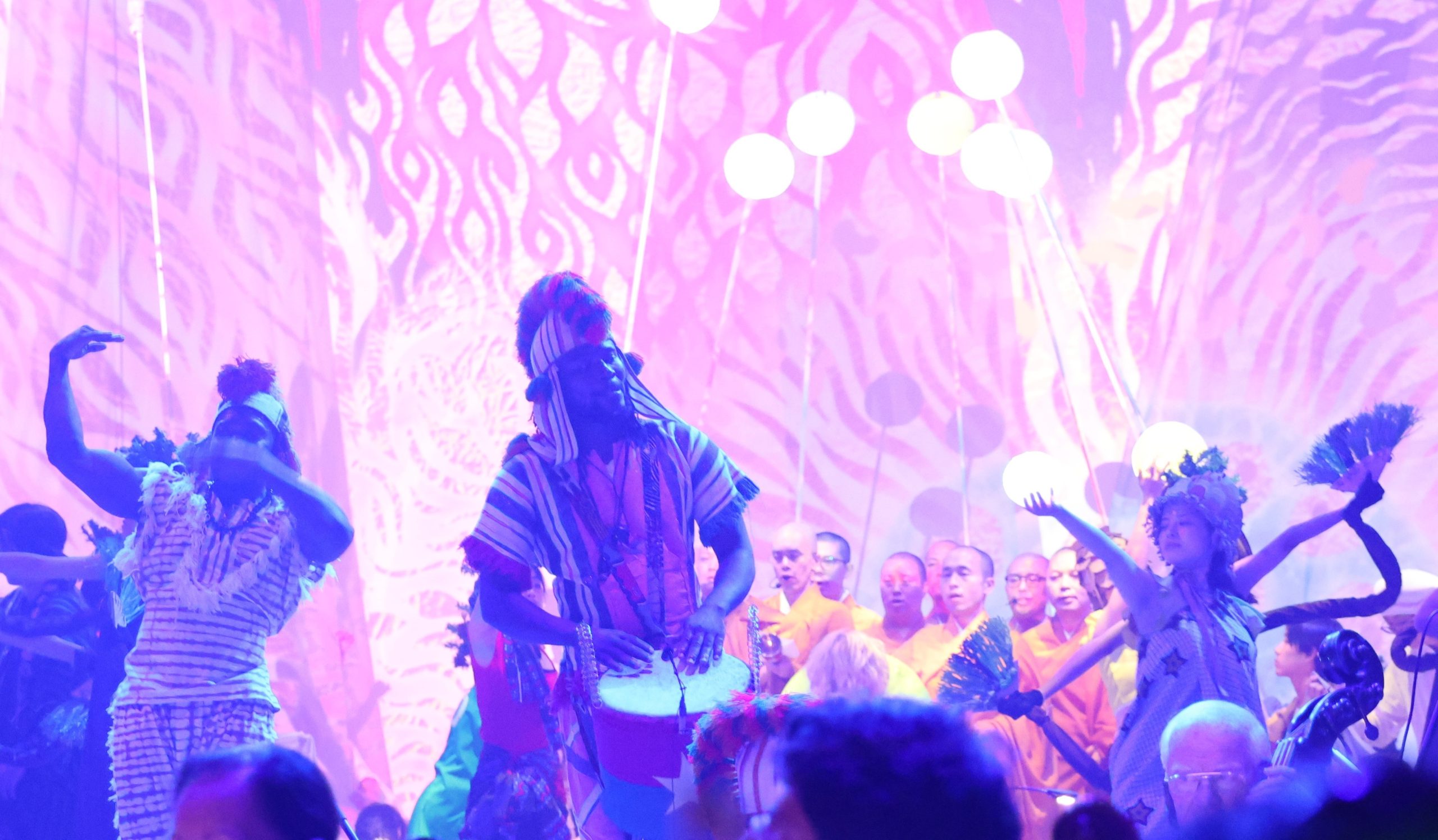 大阪・関西万博では、屋内最大ステージとなるシャインハットにて、奥河内音絵巻2025を開催しました。当日、ブルキナファソの子どもたちが描いた国宝・重要文化財「日月四季山水図」が鮮やかに会場を彩る中、河内音頭とブルキナファソのリズムが融合した音楽等のパフォーマンスが行われ、全5回の公演すべて、満員で催事を実施することができました。
