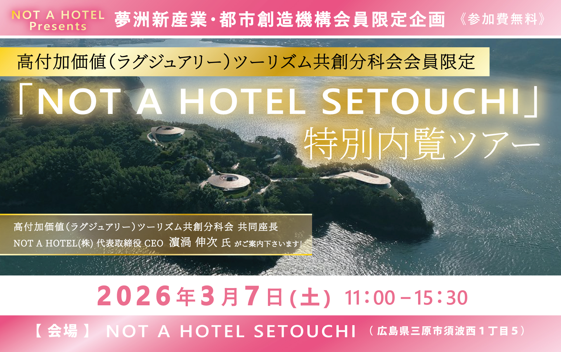 夢洲機構「高付加価値(ラグジュアリー)ツーリズム共創分科会」の活動として、共同座長のNOT A HOTEL(株) 代表取締役 CEO 濵渦 様のご高配で、瀬戸内海の離島に4月に開業する「NOT A HOTEL SETOUCHI」を事前見学させて頂く「夢洲機構会員特別内覧ツアー」を、3月7日 (土)11時~15時30分に開催いたします。