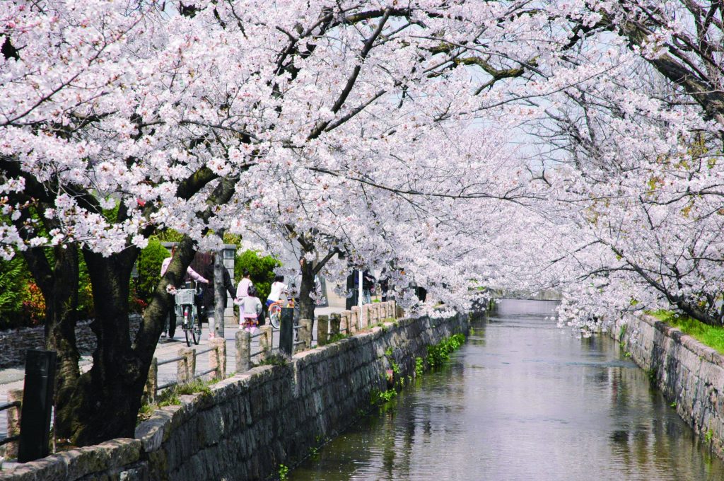 市東部の住宅地を南北に貫いて流れる玉串川。昭和40年ごろから周辺住民が協力して植えた桜の苗木が成長し、春には約1000本のソメイヨシノが5キロメートルにわたって桜のトンネルを演出しています。桜並木は、近鉄河内山本駅から北側2キロメートルと南側3キロメートルの川沿いに続き、「大阪みどりの百選」や「大阪まちなみ百景」にも選ばれたことのある桜の名所です。